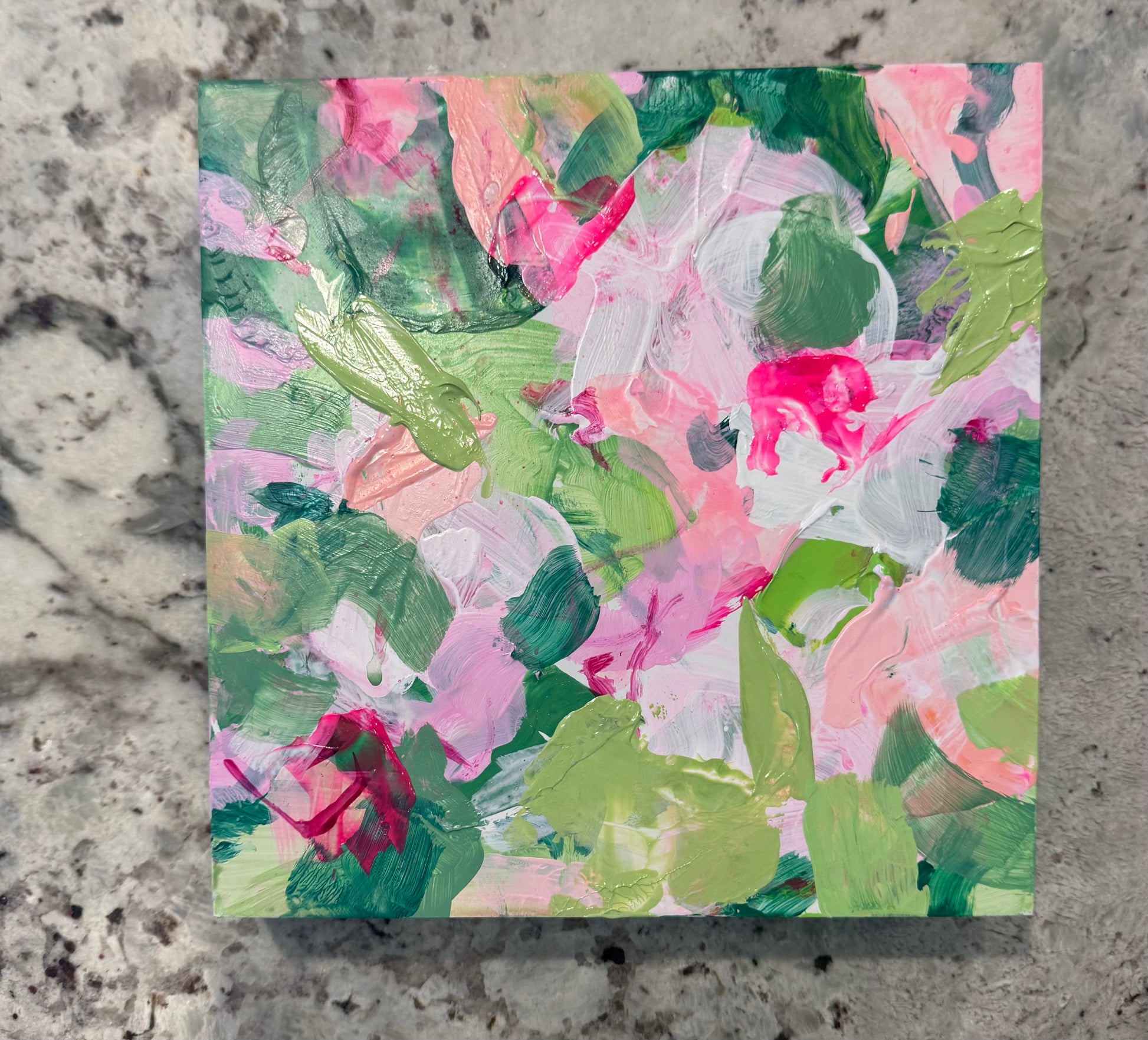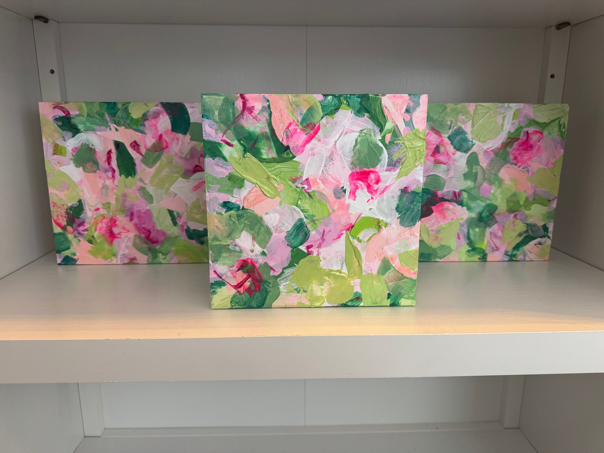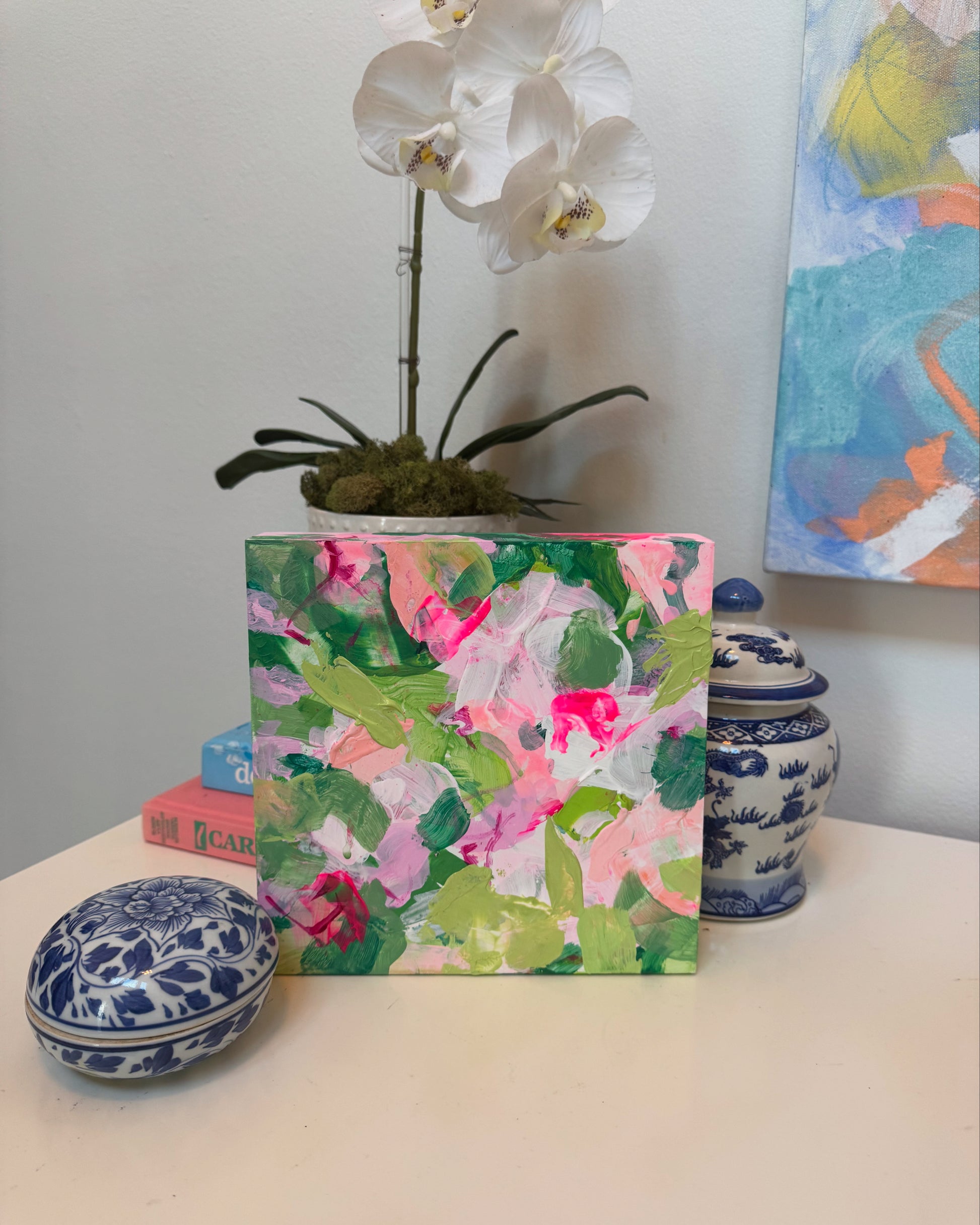 Each piece is 8"x8" on artist panel - perfect for a shelf, gallery wall, or powder room refresh. They can stand on their own or hang.