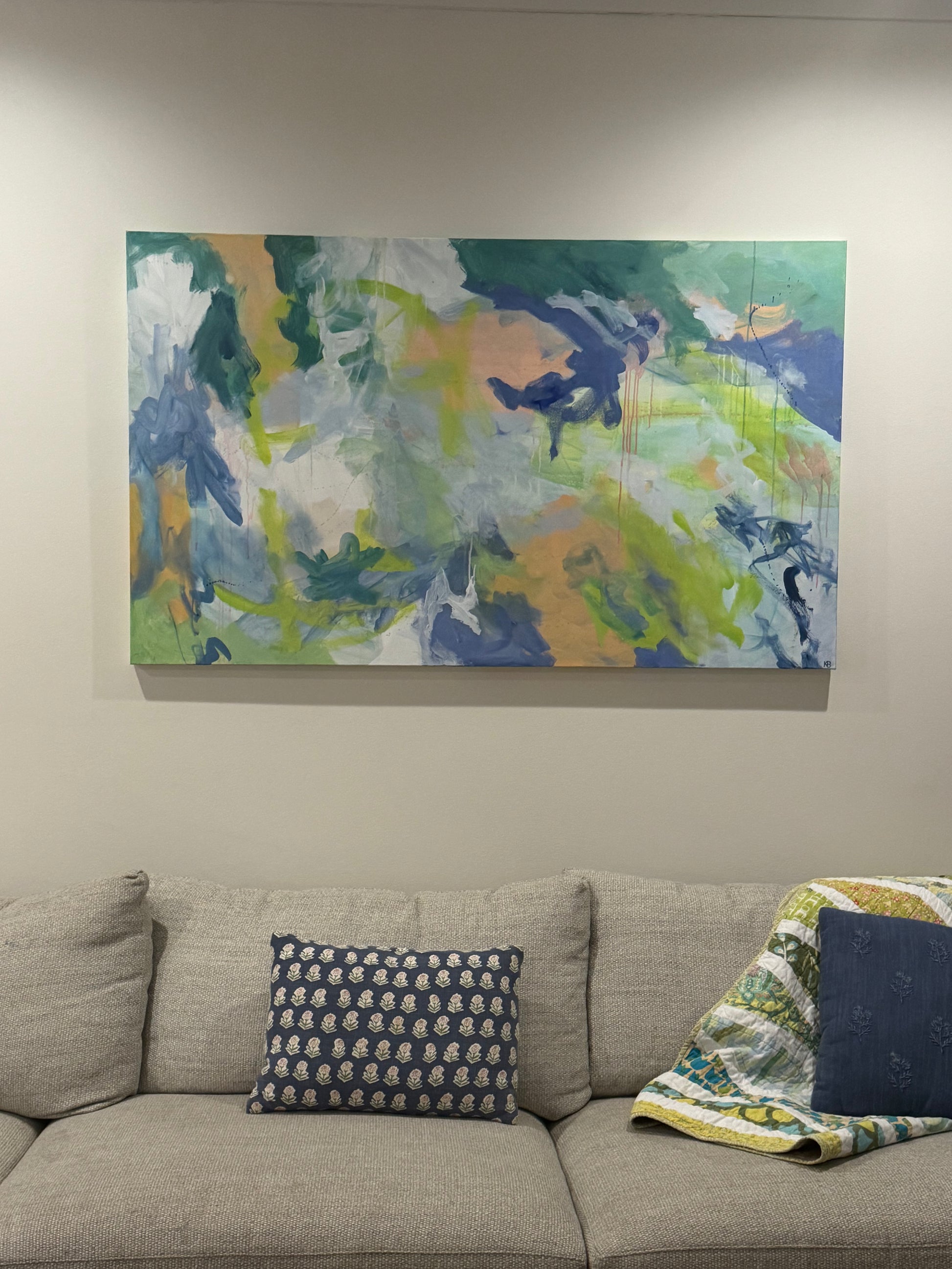 Verdant Dream is a luminous abstract that captures the energy of nature in motion. Soft washes of blue, green, and golden ochre interplay with expressive brushstrokes, creating depth and movement across this expansive canvas. Hints of dripping paint lend a sense of spontaneity, while the layered composition evokes the feeling of walking through a sun dappled garden after rainfall.