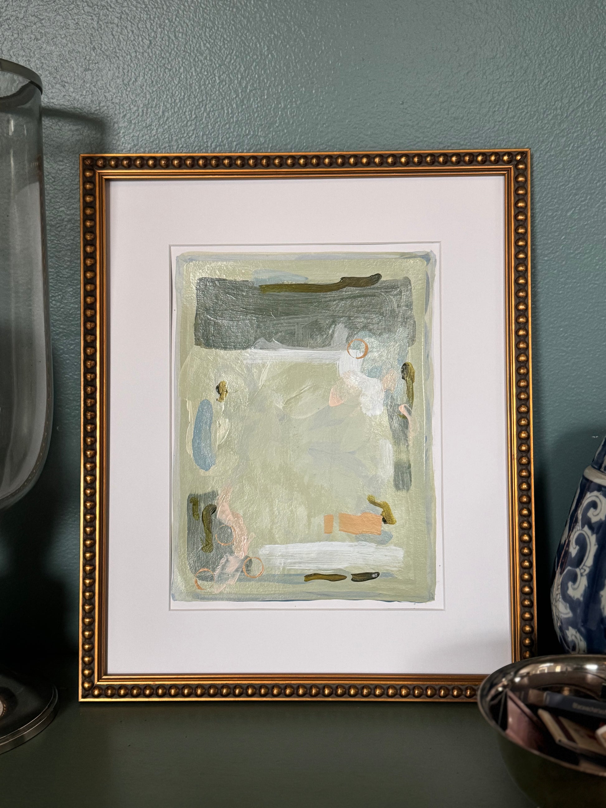 These original mixed media paintings blend soft, atmospheric color fields with expressive abstract marks to create a calming yet dynamic visual experience. Layers of sage green, misty blue, warm white, and earthly olive tones drift across the surface, giving each piece a serene, organic feel reminiscent of coastal landscapes and quiet morning light.